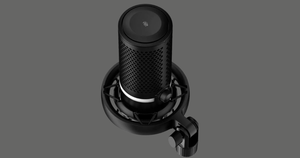 Uma das primeiras coisas que você nota ao tirar o HyperX DuoCast da caixa é o seu design elegante. Diferente do visual mais “agressivo” e grande do QuadCast, o DuoCast é mais baixo e discreto, ideal para quem não quer que o microfone ocupe metade da tela durante uma transmissão com webcam.